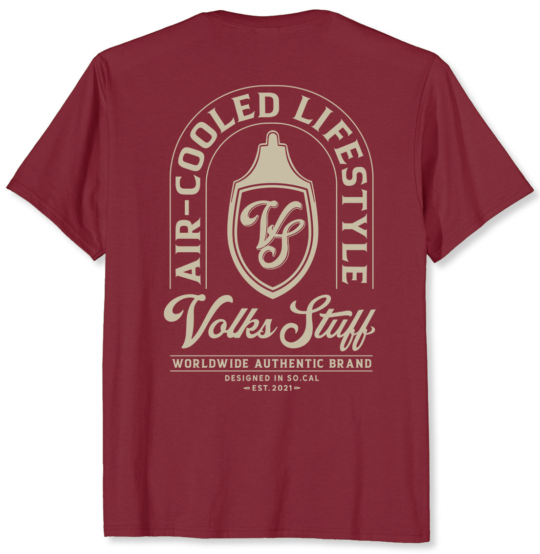 Burgundy regular fit tee featuring the Volks Stuff "VS" Crest design on the back and script logo design on the front left chest. Mid weight 5.3oz, ultra soft 100% combed cotton. Machine or hand wash cold, and low heat tumble dry or hang dry preferred.