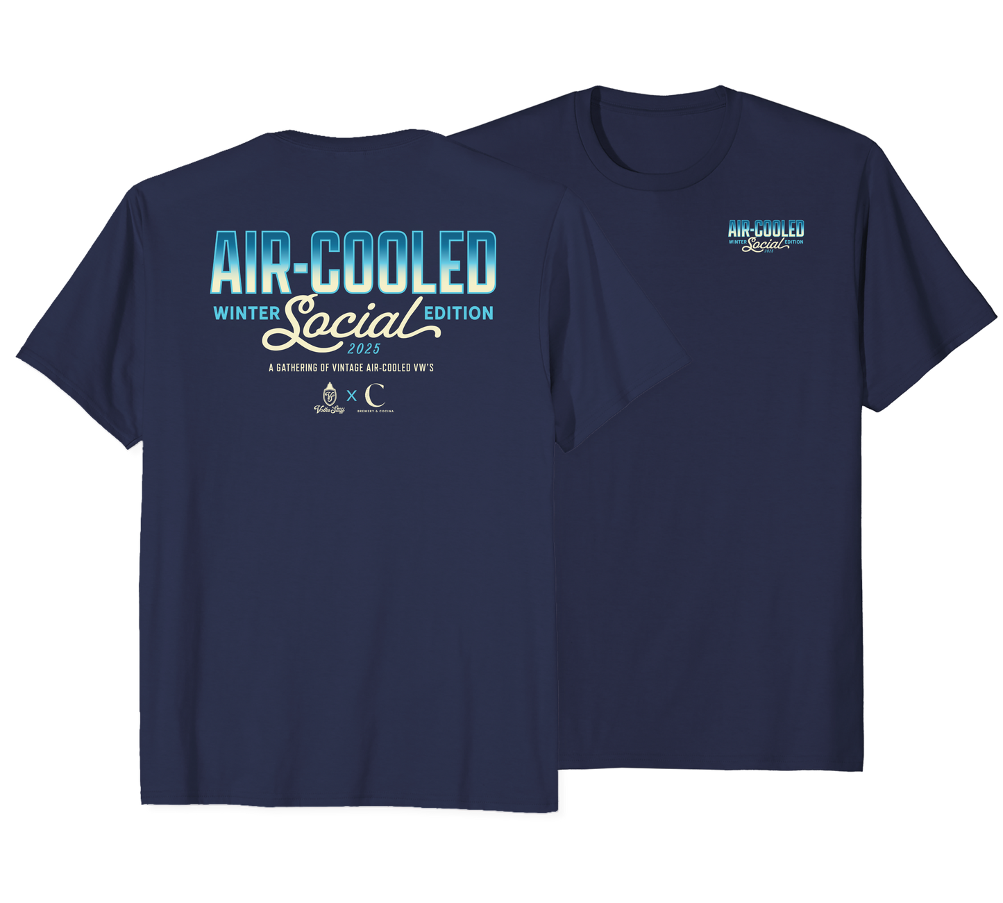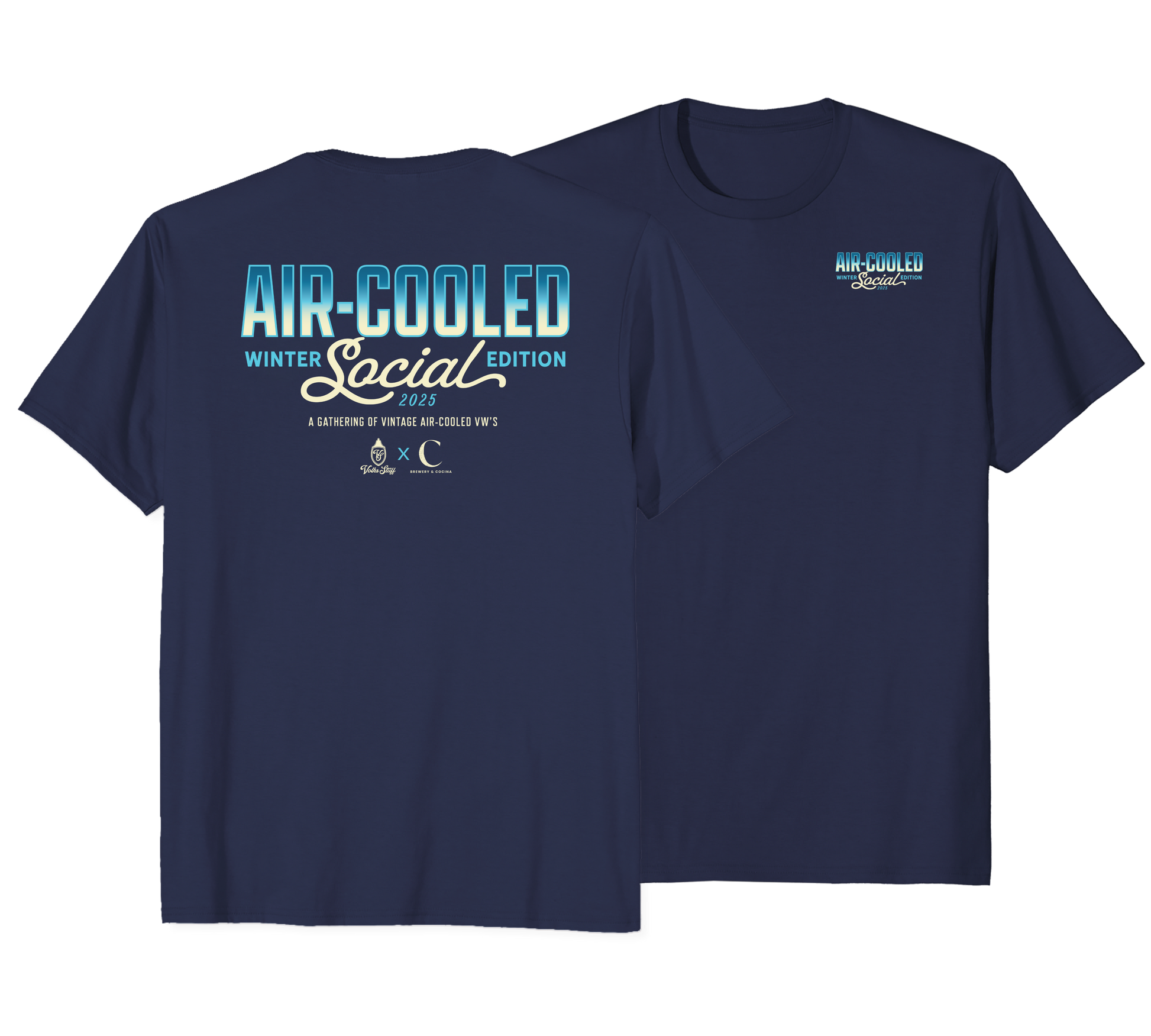 Navy blue regular fit tee featuring the Air-Cooled Social event design on the back and small design on the front left chest. Mid weight 5.3oz, ultra soft 100% combed cotton. Machine or hand wash cold, and low heat tumble dry or hang dry preferred.