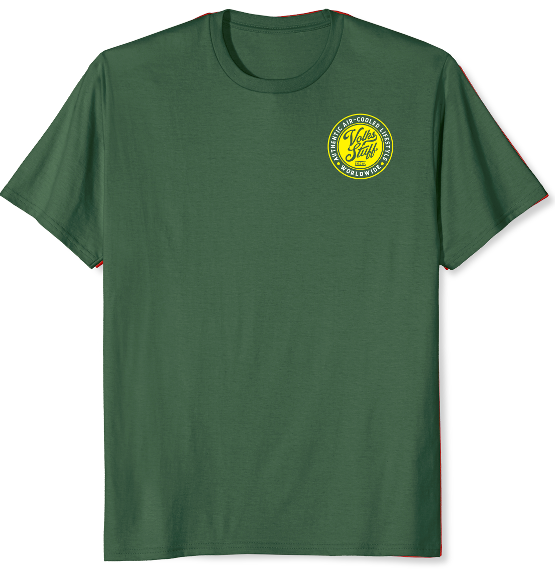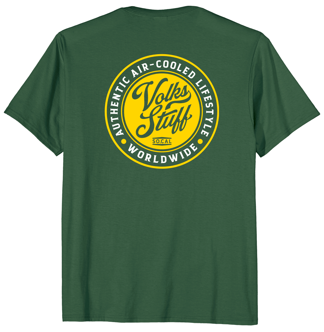 Green regular fit tee featuring the Volks Stuff "OG" logo design on the back and three inch logo design on the front left chest. Mid weight 5.3oz, ultra soft 100% combed cotton. Machine or hand wash cold, and low heat tumble dry or hang dry preferred.