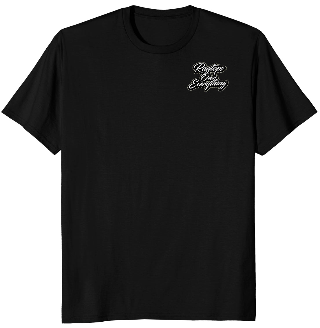 Black regular fit tee featuring the Volks Stuff Ragtops Over Everything design on the back and Ragtops Over Everything script design on the front left chest. Mid weight 5.3oz, ultra soft 100% combed cotton. Machine or hand wash cold, and low heat tumble dry or hang dry preferred.